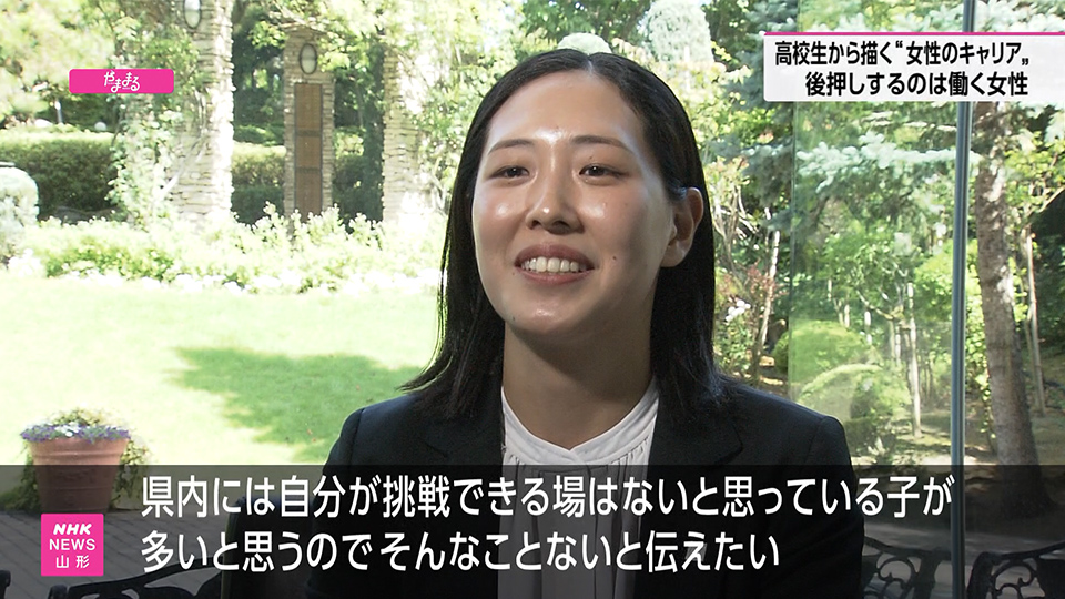 NHKでは、男女雇用機会均等法40周年の節目に、県内で活躍する女性を紹介する特集が放送されました。その中で、パレスグランデール企画課の安部結衣が、山形市主催の女子高校生向けキャリアワークショップにアドバイザーとして参加する様子が取り上げられました。学生たちは自身の得意なことや価値観を見つめ直し、県内企業で働く女性との交流会も行いました。