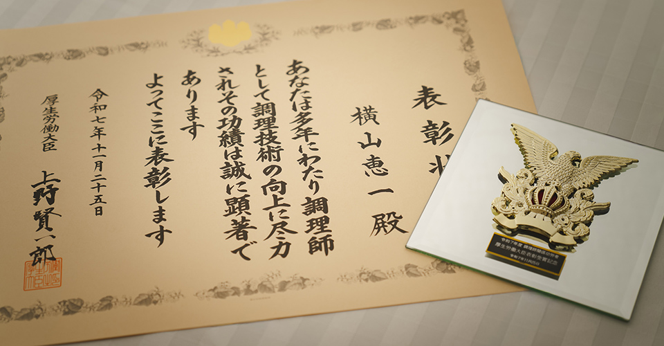 2025年11月25日、山形市が主催する「令和7年度 調理師関係功労者厚生労働大臣表彰」において、パレスグランデールの西洋料理長・横山恵一が表彰されました。横山は、西洋料理の発展と若手育成、地域貢献への尽力が認められ、全国73名の調理業務功労者の一人として選出されました。
