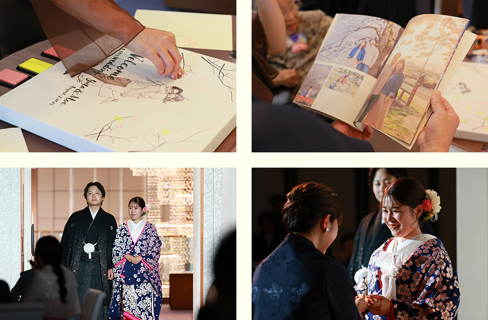 初デートは秋田の桜の名所「角館武家屋敷通りの桜ロード」。その思い出がいつまでも色鮮やかであるように新婦様手作りのウェルカムボードには桜の木が描かれ、ゲストからのスタンプによって満開に咲き誇りました。そして新婦様の色打掛も美しい桜柄。披露宴会場へ入場後、お母様から扇子を受け取りメインテーブルへと進みました。