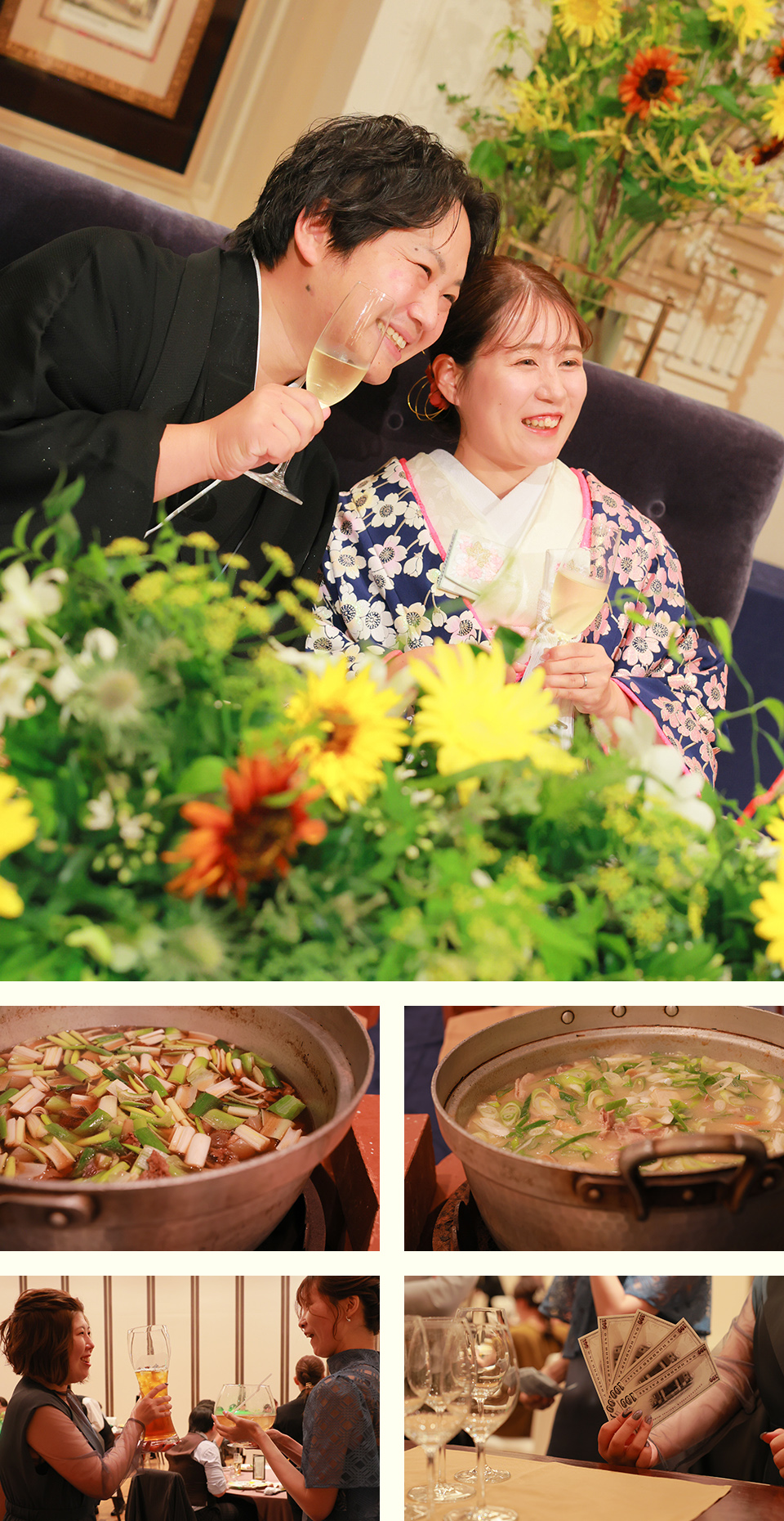 おふたりらしさ=山形らしさ!のおふたりは、特製芋煮のご提供。醤油味と味噌味の2種類に舌鼓を打ちました。そして冷たい生ビールも追加!ウェルカムパーティのゲームで獲得したパレスマネーでドリンクのグラスをビッグにできるというサプライズも!