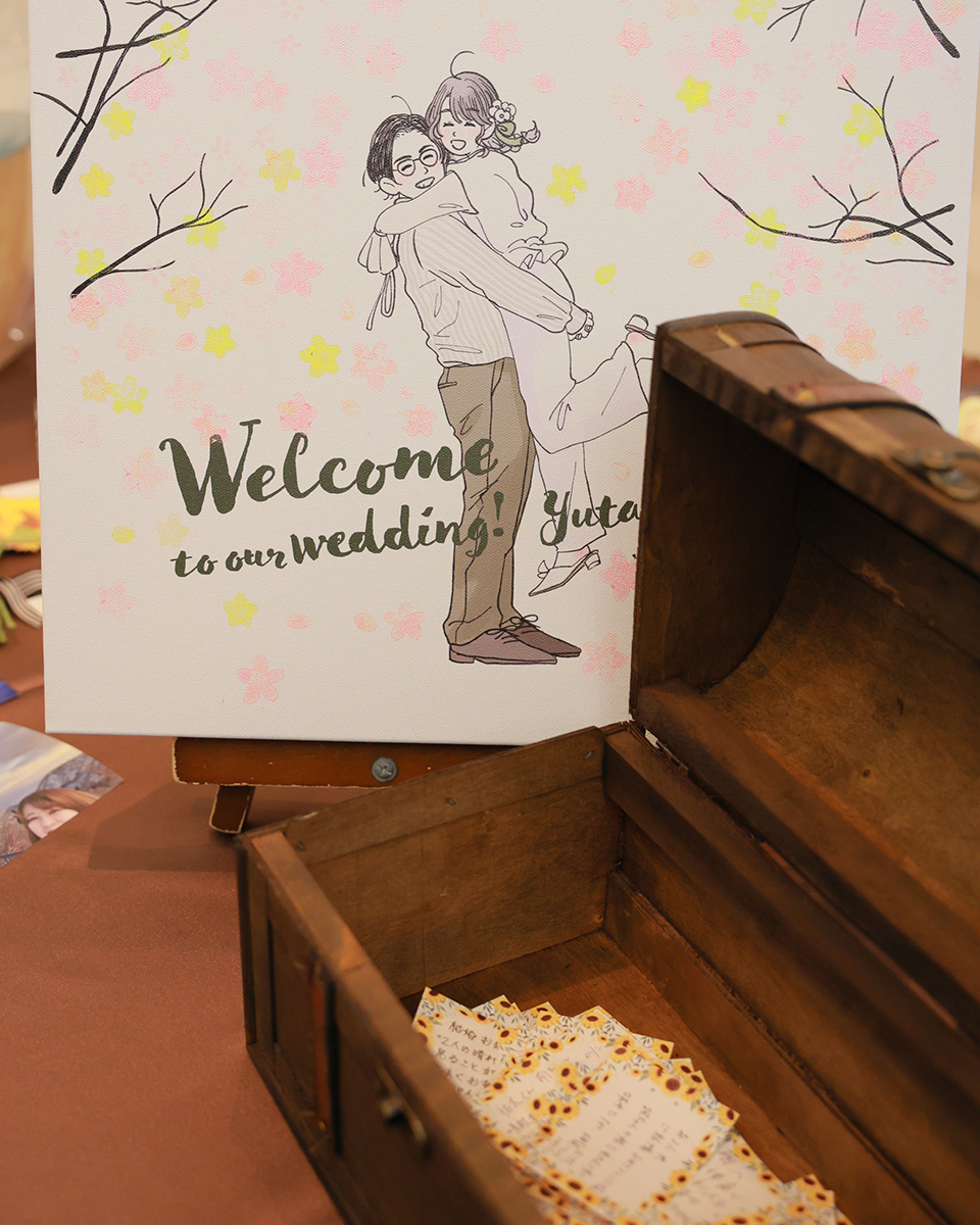 退場前、おふたりに手渡された空っぽの宝箱は、ゲストからの祝福の言葉たちでいっぱいになりました。祝福に満ちた一日はひまわりのように明るい輝きで溢れました。この日の思い出も、これからの人生を温かく照らし続けていくことでしょう。